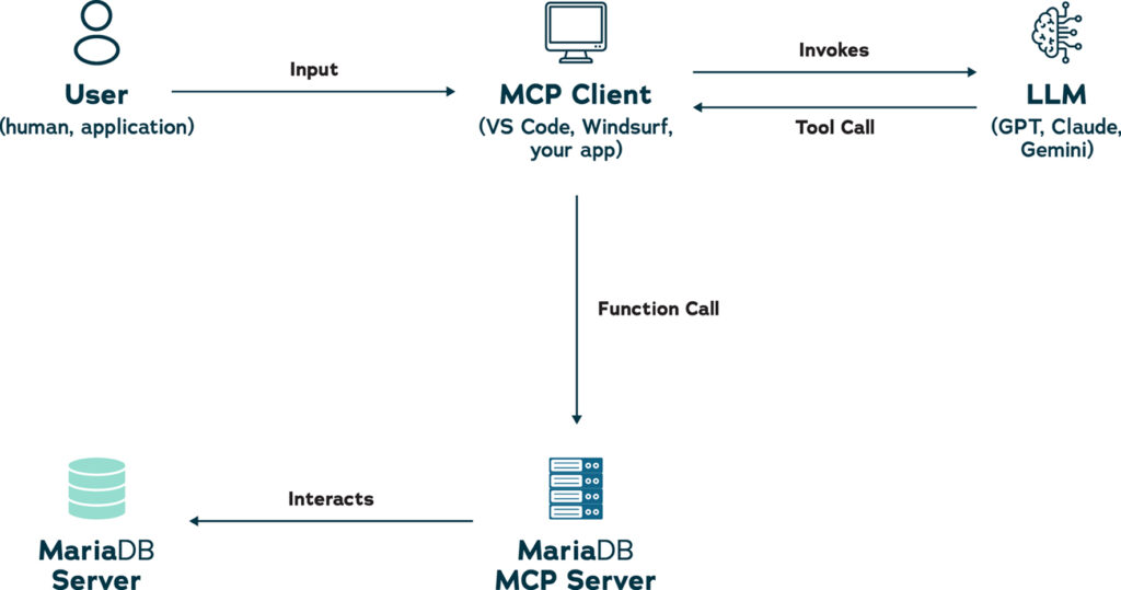 In general, an MCP server exposes predefined function calls to backend logic, APIs or databases. Using MariaDB as an example, the following diagram illustrates the concept: